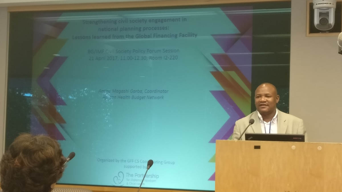 As we gear up for the Global Financing Facility (GFF) Investors’ Group (IG) meeting on the 24th and 25th April 2017, the GFF Learning Meeting as well as the Spring Meetings in DC have provided a number of opportunities for civil society to get together to share experiences, constraints and opportunities for meaningful engagement in the GFF processes in their countries.On Friday 21st, the Civil Society Coordination Group on GFF hosted a high-level panel on CSO engagement in the GFF. In his opening remarks, Aminu Magashi Garba, the Africa Health Budget Network (AHBN) coordinator and CSO representative on the IG, encouraged a frank and open discussion so that we could learn from each other and identify ways to work more effectively.Each of the panelists shared insights of how Civil Society Organisations (CSOs) are engaging in the GFF processes: