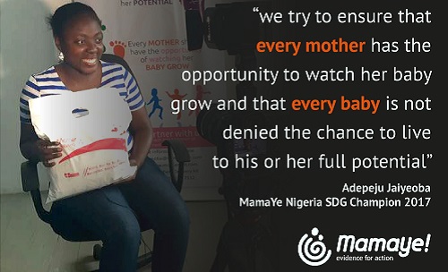 To mark this years’ United Nation General Assembly MamaYe-Evidence4Action Nigeria are celebrating Adepeju as our SDG 3 champion of 2017. Her good work and initiative in reducing maternal and newborn mortality in Nigeria, through the distribution of ‘Mother’s delivery kit’ containing sterilised equipment birth attendants use during child delivery, and extensive training of Traditional Birth Attendants (TBA) and Community Health Extension workers (CHEW) in rural communities, it to be commended.