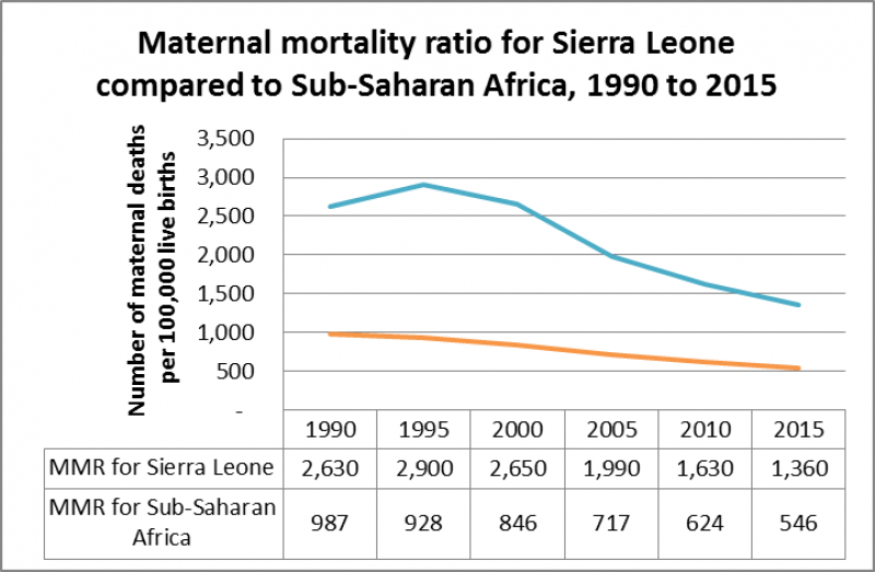 The report shows that there seems to be an improvement over time from 1990 to 2015, as shown in the graph below. However, as the graph also shows, the maternal mortality is far higher in Sierra Leone than that for Sub-Saharan Africa as a whole, where the maternal mortality ratio for 2015 stands 546 maternal deaths per 100,00 live births – that’s less than half that of Sierra Leone.