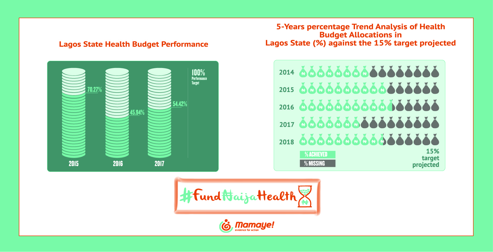 This is the Lagos State Health Budget allocation- performance and expenditure trend analysis, the analysis depicts the percentage annual health budget allocations for 5 years against the 15% target projected and a 3 years budgeted fund release performance.